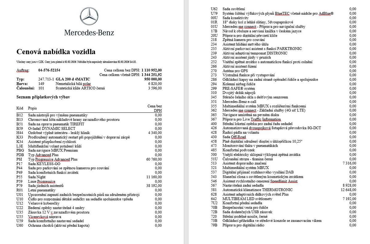 Mercedes-Benz GLA 200d 4M, CZ, 1. majitel: kombinovaná spotřeba paliva: 0 l/100km; kombinované emise CO2: 0 g/km (WLTP).